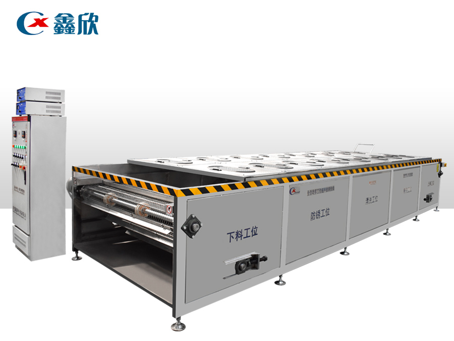 該設備有上下料網帶、超聲波清洗工位、噴淋漂洗工位、高壓風切、熱風烘干工位、溫控水加熱系統、風機、溫控空氣加熱系統、移動式風刀、PLC+觸摸屏控制系統、管路系統及智能電器控制系統等組成。自動進排液和自動加溫系統完全實現了無人干預,自動運行,很大程度上降低了工人的勞動強度。先進的霧氣處理系統可以將清洗時產生的霧氣冷凝回流,空氣經過濾和活性炭吸附后排出。