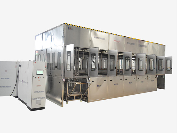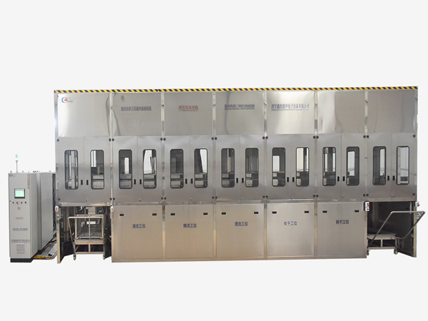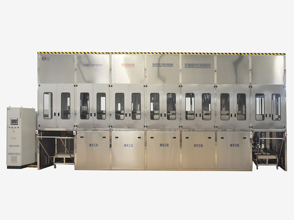 該設(shè)備為全自動高潔凈度清洗烘干機(jī),采用超聲波清洗工藝。整機(jī)采用2套龍門桁架式傳動機(jī)構(gòu),PLC+觸摸屏控制。該設(shè)備共七個工位:上料工位、超聲波清洗工位、超聲波漂洗工位、鼓泡漂洗工位、高壓風(fēng)切工位、熱風(fēng)干燥工位、下料工位。該設(shè)備還包含霧氣處理裝置、循環(huán)過濾、拋動裝置、管路系統(tǒng)及智能電器控制系統(tǒng)等組成。該設(shè)備清洗效果好、提高了工件的清潔度。該機(jī)結(jié)構(gòu)設(shè)計及工藝安排合理、自動化程度高、清洗精度高,有效解決了此類工件的清洗難題。