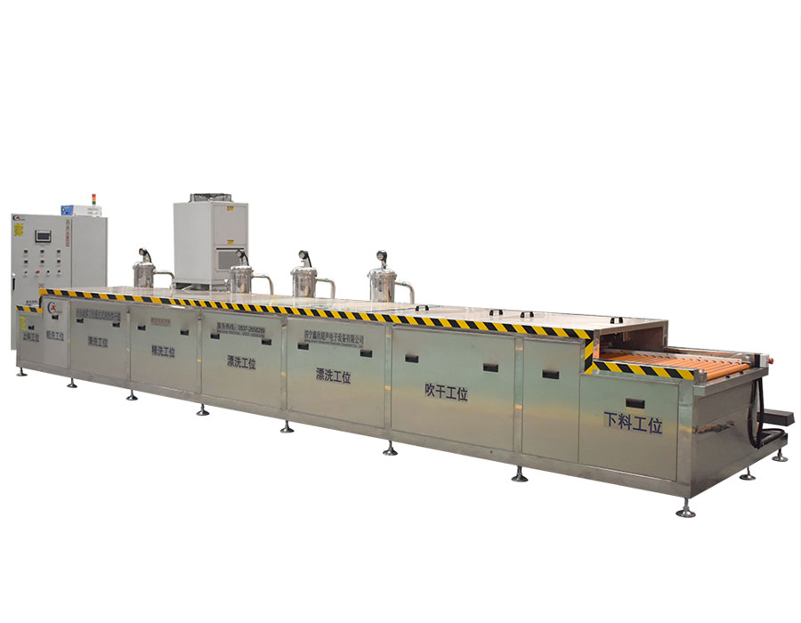 本設備為通過式玻璃清洗烘干線,清洗部分傳動形式采用專用輸送鏈條帶動,與玻璃接觸面都是橡膠包裹之后的滾筒,清洗該設備有上料滾筒線、噴淋清洗工位、毛刷清洗工位、噴淋清洗工位、超聲波清洗工位、噴淋漂洗工位、風干工位、下料滾筒線、溫控水加熱系統、溫控空氣加熱系統、PLC+觸摸屏控制系統、管路系統及智能電器控制系統等組成。該設備清洗效果好、提高了工件的清潔度。該機結構設計及工藝安排合理、自動化程度高、清洗精度高,有效解決了此類工件的清洗難題