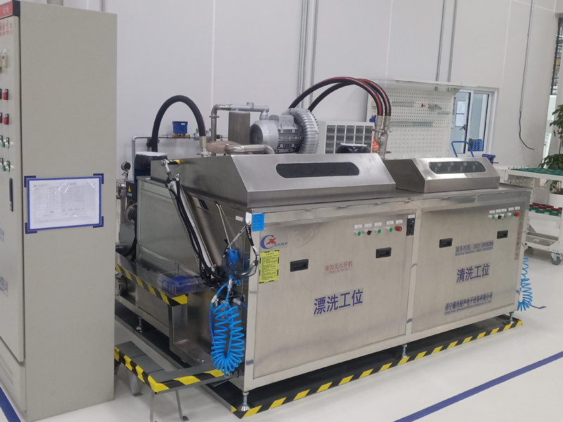 清洗設(shè)備包含兩個(gè)水平的工位,噴淋超聲波清洗工位、旋轉(zhuǎn)漂洗吹干工位,每個(gè)工位均配置人工吹掃氣槍。工藝流程:人工上料→噴淋+超聲波清洗→旋轉(zhuǎn)噴淋漂洗+吹干→人工吊出料框